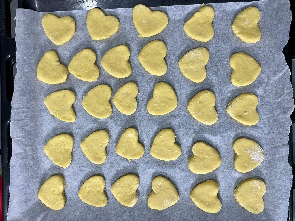 Corte las galletas con un cortador de galletas de la forma que prefiera; yo he elegido una de corazón. Dispóngalas en dos bandejas recubiertas con papel de horno y hornéelas en horno precalentado a 180°C durante unos 15 minutos, hasta que la base esté dorada. En este punto, apague el horno: si prefiere galletas con un corazón suave, sáquelas inmediatamente; si las desea más crujientes, déjelas enfriar dentro del horno apagado. ¡Ahora solo queda disfrutarlas!