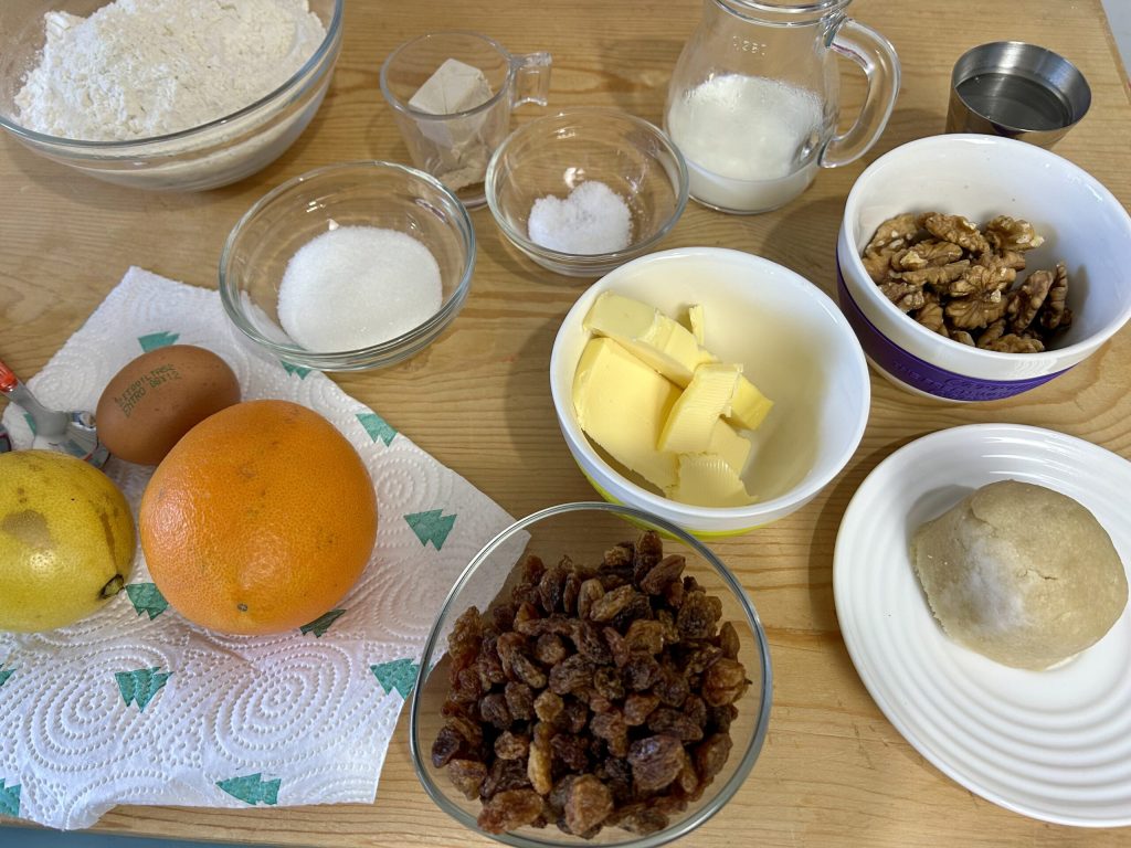 • Cuando la masa comience a compactarse, la trasladamos a una superficie de trabajo ligeramente enharinada y amasamos para formar un bollo. Posteriormente, aplanamos la masa con las palmas de las manos y añadimos en su interior las pasas y las nueces troceadas. Mezclamos para incorporar bien los ingredientes, teniendo cuidado de no calentar demasiado la masa con el calor de las manos. Si utilizáis la batidora, podéis completar también estos pasos directamente en la máquina. Cuando la masa esté lista, la dividimos en dos partes iguales para obtener dos bollos. Dejamos que estos bollos leuden en el horno apagado, cubiertos por un paño durante aproximadamente una hora o incluso menos, solo deben moverse ligeramente, no es necesario que doblen su tamaño.