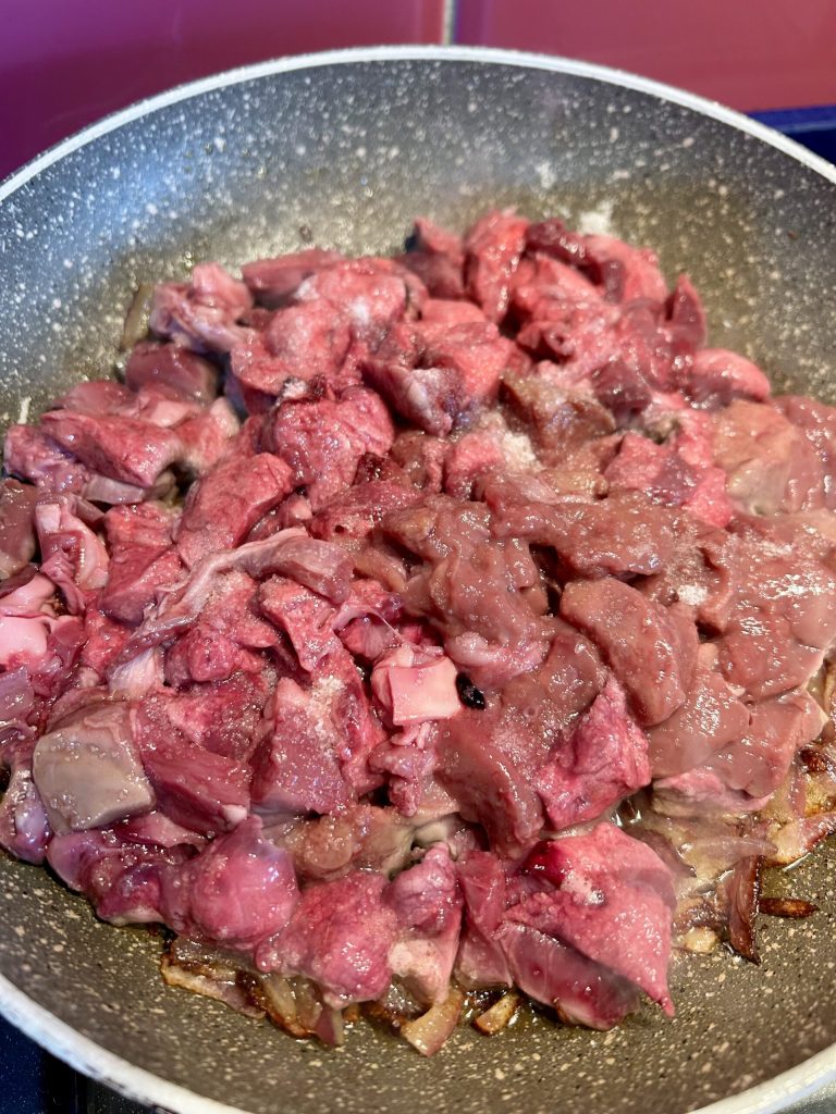 Cuando la coratella esté cocida por todos los lados, desglasad con un poco de vino blanco. Bajad ligeramente el fuego y continuad la cocción, permitiendo que el vino se evapore. A medida que el vino se seca, veréis formarse una salsa rica y suculenta. En este punto, la coratella debería estar cocida a la perfección, con una consistencia tierna y un sabor intenso, lista para ser servida.
