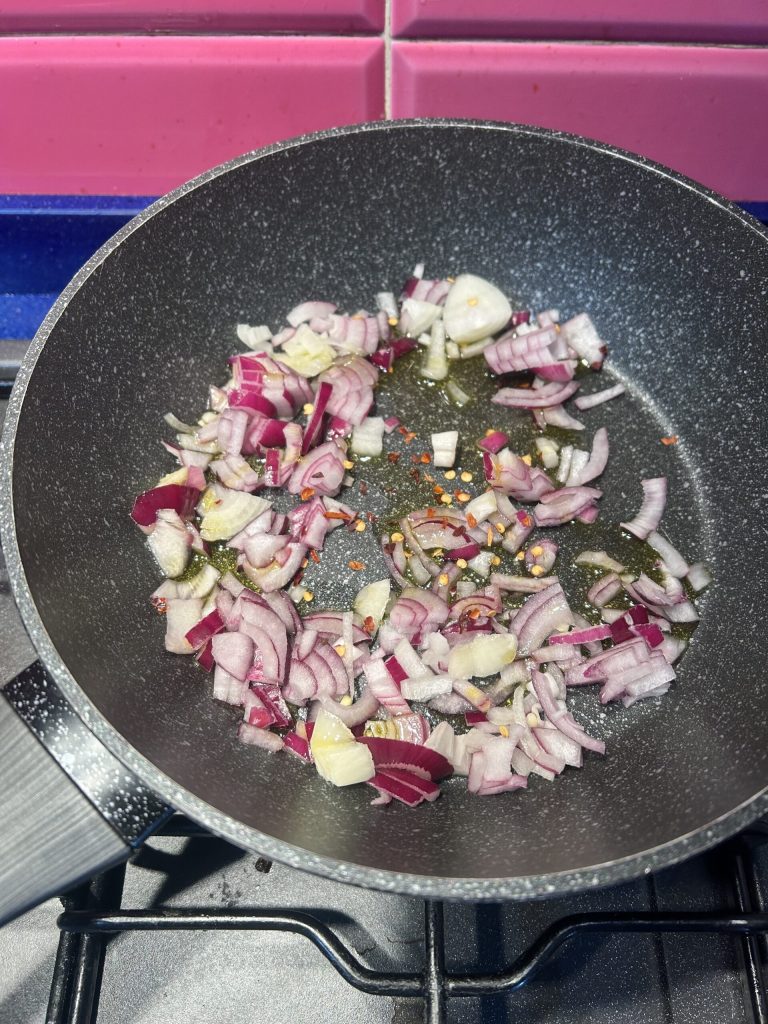 Pela y lava la cebolla para evitar llorar mientras la cortas. Corta la cebolla groseramente y ponla a dorar en la sartén junto con el aceite y la guindilla.