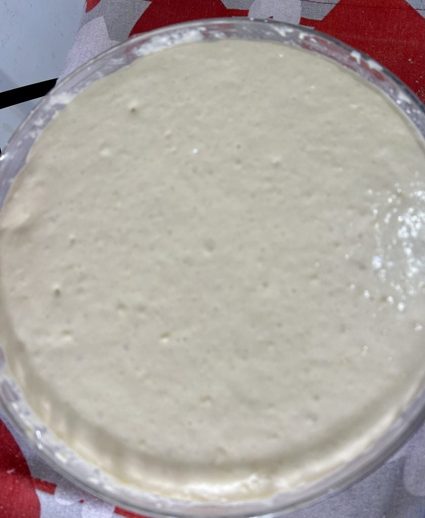 Después, he cubierto el bol con film transparente y he dejado que fermente durante aproximadamente una hora y media. Como se puede ver en la foto, la masa crece bien y se forman bonitas burbujas de fermentación, señal de que está lista para ser extendida.