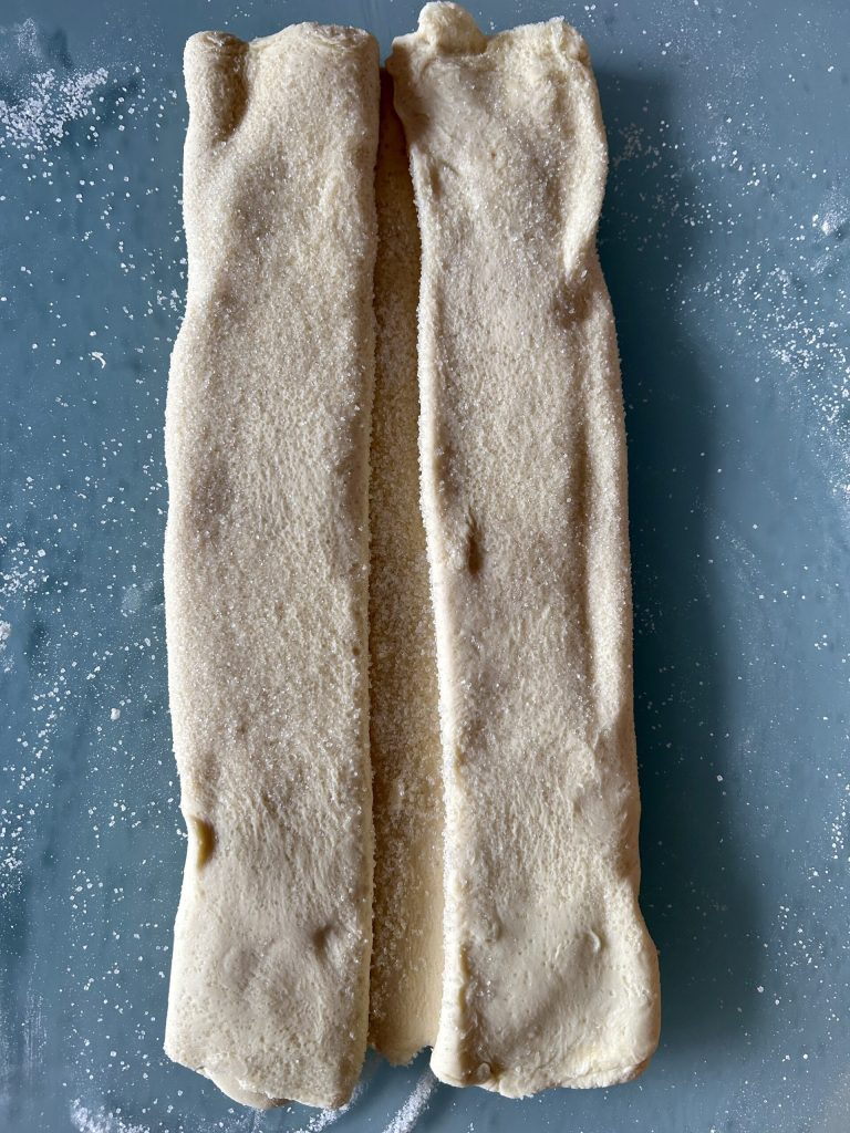 Otro paso fundamental es extender el hojaldre sobre azúcar granulada y esparcir bien la superficie antes de plegarla, siempre con abundante azúcar granulada; para facilitar esta operación os recomiendo mojar ligeramente el hojaldre con un poco de agua para permitir que el azúcar se adhiera bien y de manera uniforme.