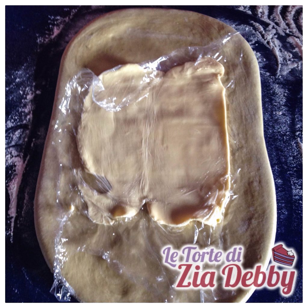 • Espera a que la masa se ligue bien, luego transfiérela a una superficie de trabajo bien enharinada y crea un rectángulo, en el centro de este rectángulo coloca la mantequilla que previamente habrás sacado del frigorífico, puesto entre dos hojas de film transparente y extendido a un grosor de unos tres milímetros.