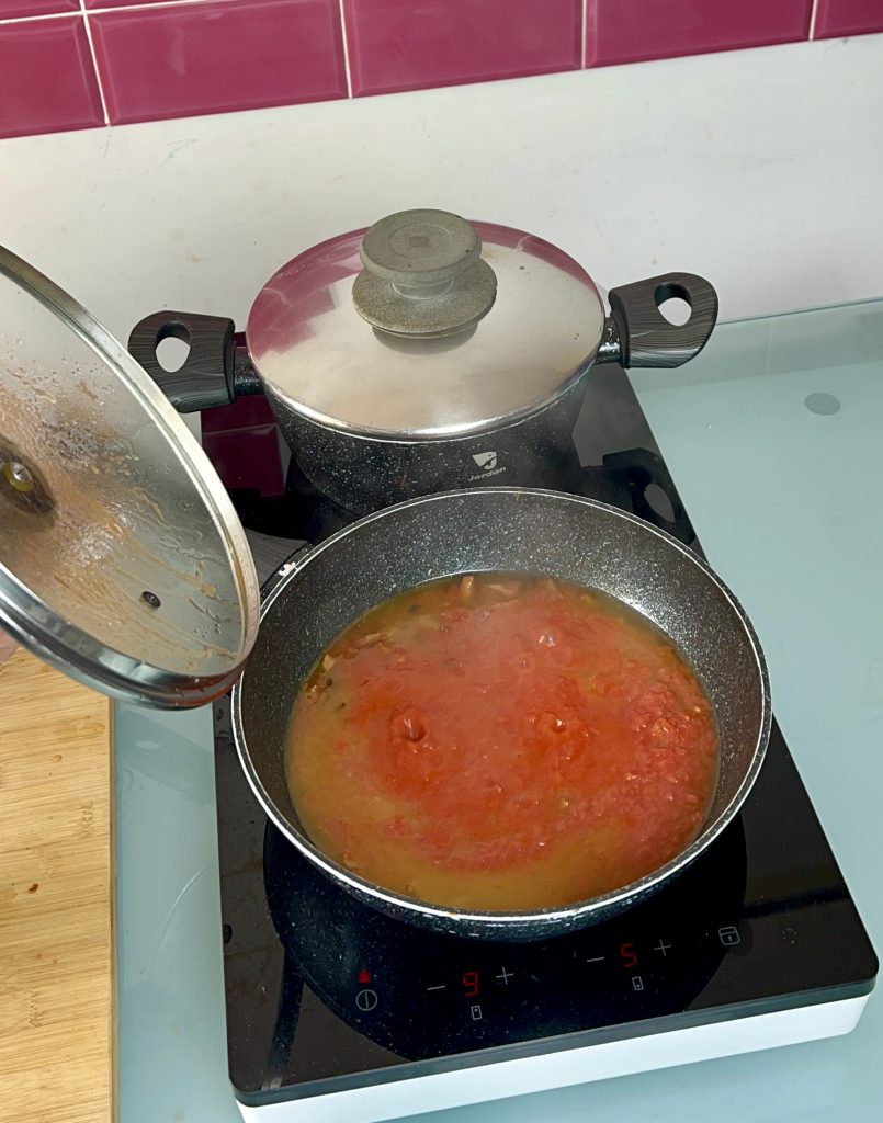 El vino no debe reducirse completamente. Cuando haya evaporado un poco, añadir la pulpa de tomate, ajustar con sal y dejar cocinar a fuego moderado durante unos 20 minutos, o hasta que esté bien cocido. Mientras preparas la salsa, pon al fuego una olla alta con agua y un poco de sal gruesa, servirá para cocer la pasta.