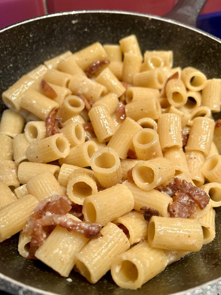 Volved a poner la sartén con el guanciale en el fuego cuando estéis por escurrir la pasta y llevarla a temperatura viva, cuando comience a chisporrotear, añadid la pasta. Para escurrir bien la pasta sin llevar demasiada agua pero dejándola con la cantidad adecuada de agua para repasar, os recomiendo escurrirla sacándola directamente de la olla con un cucharón perforado de malla grande. Así la lleváis directamente a la sartén, la repasáis un poco con el guanciale, apagad y añadid una parte del pecorino y un poco de pimienta, mezclad bien y emplatad.