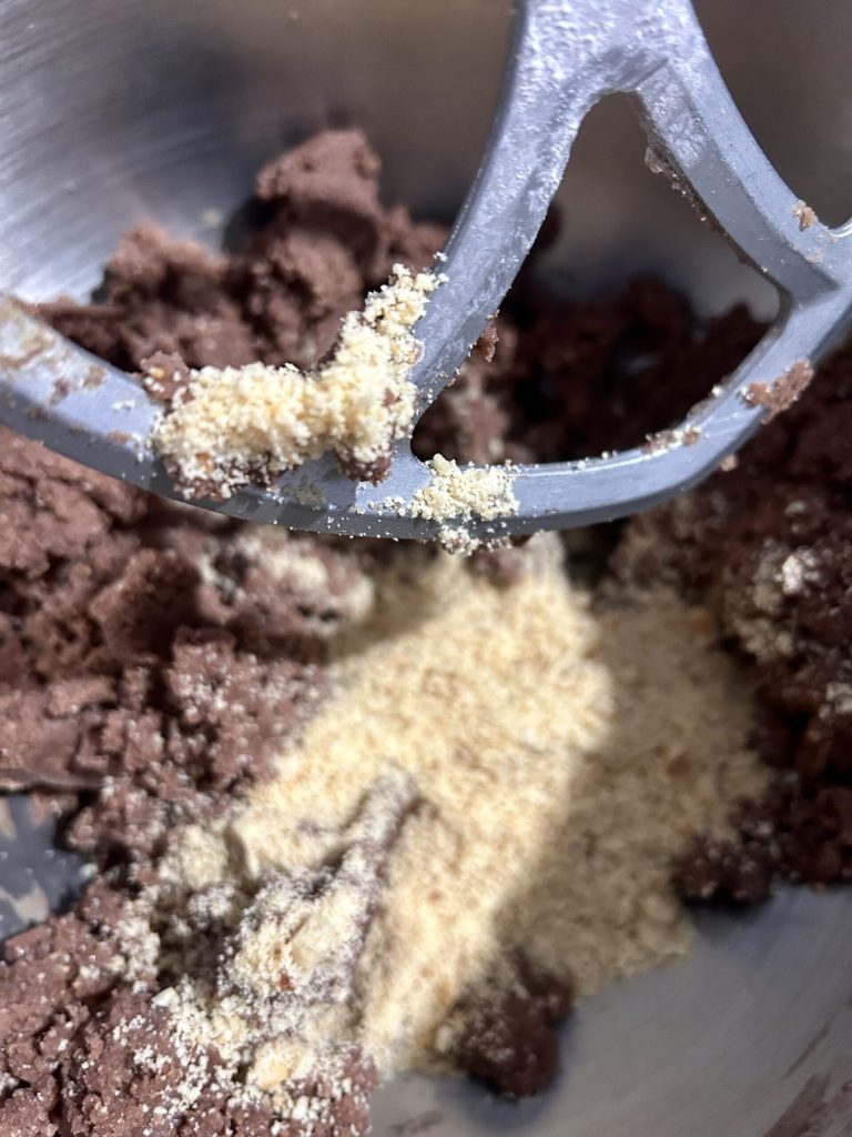Introducir todos los ingredientes juntos excepto las avellanas en el bol de la batidora planetaria montando el gancho de hoja y comenzar a velocidad media/baja hasta que se forme la masa, llevará pocos minutos, pero no te asustes si al principio la ves toda desmenuzada, a medida que la mantequilla se integra en la masa se volverá más compacta.