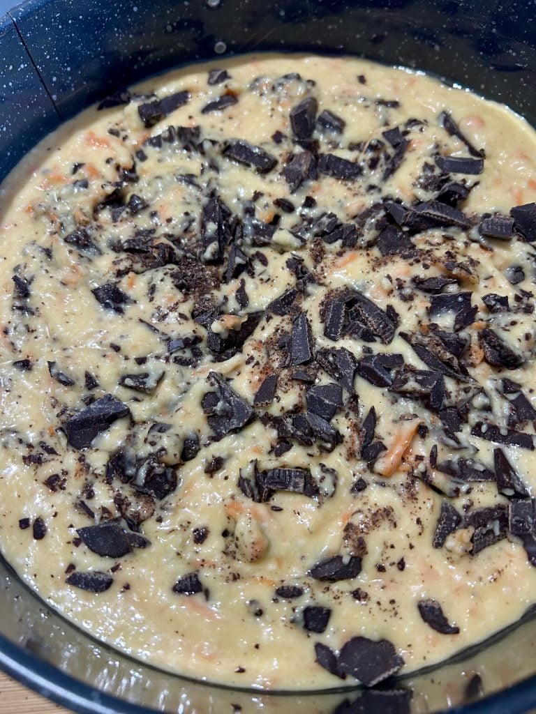En este punto añadís gradualmente el resto de los ingredientes, siguiendo el orden indicado en la lista: harina, harina de coco, zanahorias ralladas, leche y aceite. La levadura se incorpora al final, mientras que el chocolate troceado lo añadiremos solo en la superficie.