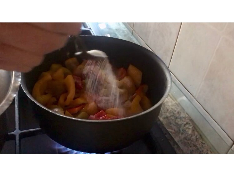 Cuando los pimientos estén bien sofritos, añadir la cucharadita colmada de azúcar y tres cucharadas de vinagre, bajar el fuego a medio y terminar la cocción, en total deberían ser unos 20′.