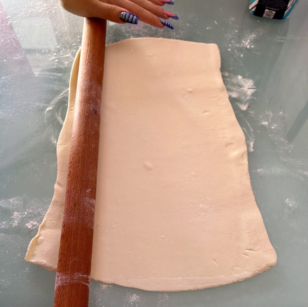 En la imagen se ve a mi hija extendiendo el hojaldre que hemos preparado en casa, así que si seguís la receta con nuestro hojaldre solo hay que tomar el bloque y extenderlo en un gran rectángulo de 5/6 mm de grosor.
