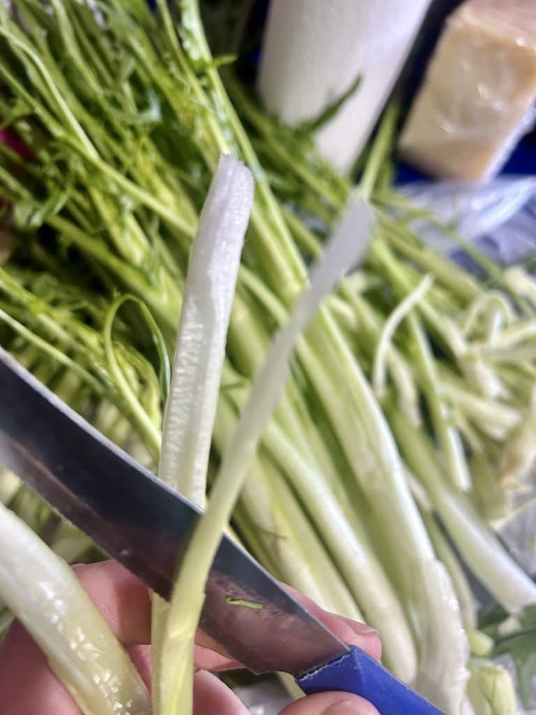 Cuando lleguéis al «blanco» del cogollo de las puntarelle o brotes, retiradlos uno a uno y cortad la parte inferior más dura. Quitad solo la parte efectivamente dura que no se pelaría porque la parte blanca que se pela con cuchillo debe utilizarse.
