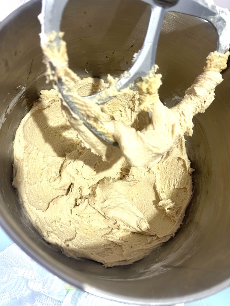 Comenzamos la preparación de las rosas del desierto montando la mantequilla con el azúcar. Entonces introducimos la mantequilla blanda pero no fundida (a punto de pomada) en el bol de la batidora de pie con gancho de hoja, añadimos el azúcar y mezclamos bien hasta que se convierta en una crema de mantequilla. Ahora añadimos un huevo a la vez, esperando que el anterior sea absorbido por la masa antes de introducir el siguiente.