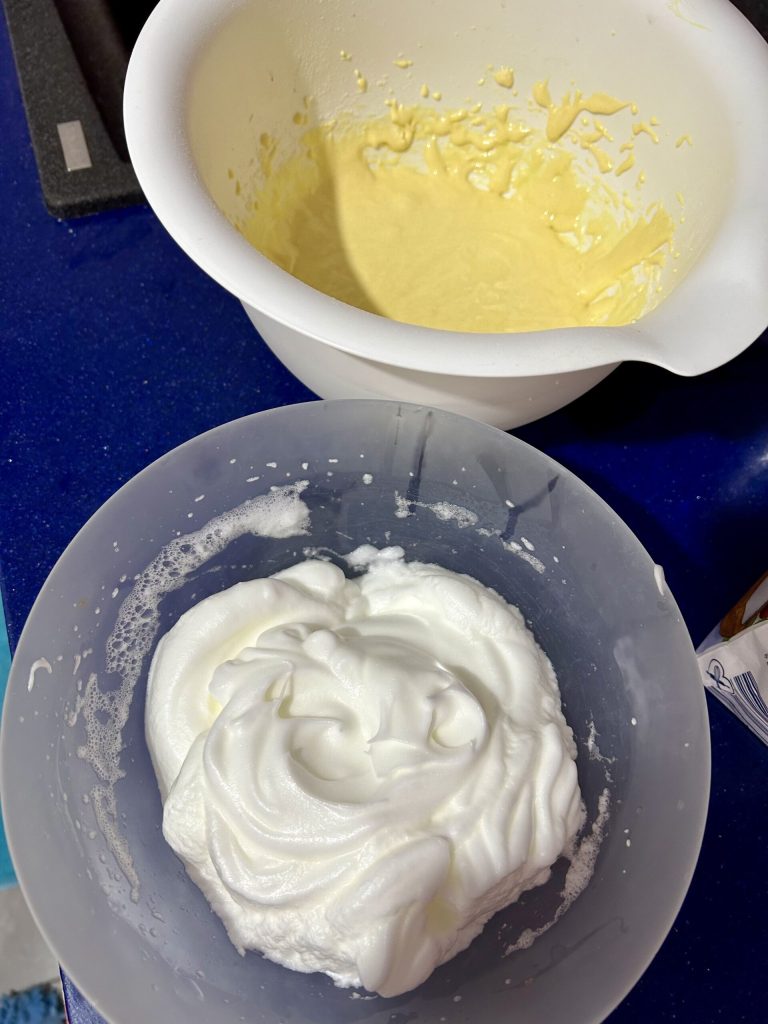 • Los primeros pasos son fundir la mantequilla y yo lo hago en el microondas. Separar los huevos poniendo las claras en el bol de la batidora de pie y las yemas en otro bol grande, añadir el azúcar a las yemas y empezar a batir con una batidora eléctrica para blanquearlas bien. Mientras tanto, poned en marcha la batidora de pie a máxima velocidad para montar las claras a punto de nieve.