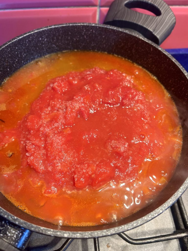 Cuando estén bien crujientes, desglasa con el vino blanco, sube la llama del fuego y deja evaporar el vino sin tapa. Cuando el vino se haya reducido, añade la pulpa de tomate.