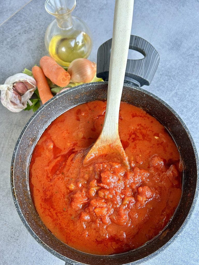Salsa vegetal, un condimento ligero pero con gran sabor que puede ser una alternativa válida al clásico ragú de carne. Podemos usar la salsa vegetariana para condimentar la clásica pasta y preparar pasta al horno. Necesita siempre una cocción bastante larga, al menos un par de horas para amalgamar todos los sabores. Se empieza con un buen sofrito de cebolla, ajo, apio y zanahoria, añadiendo también un poco de guindilla, luego me gusta aromatizarlo a mitad de cocción con hojas de laurel. No contiene soja ni similares porque no pretende ser un ragú, pero tampoco la clásica salsa rápida, sentirás en la cocina el buen aroma que desprende durante la cocción.