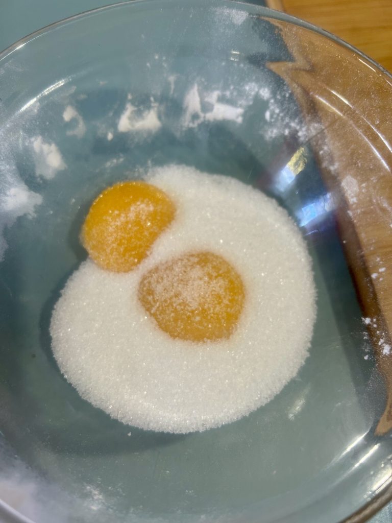 Preparad la crema de ricotta comenzando por las yemas bien batidas con el azúcar dentro de un bol. Debéis batir las yemas hasta que estén bien hinchadas y blanqueadas, por eso os recomiendo usar una batidora eléctrica, pero también podéis montarlas a mano con un poco de energía😂