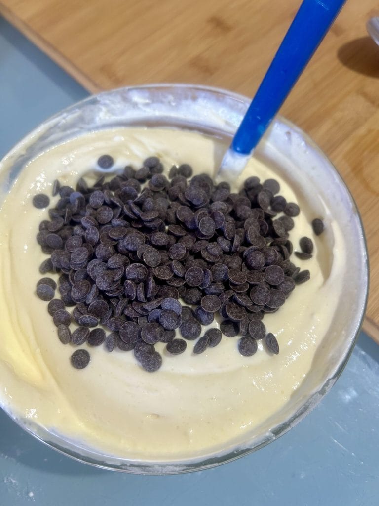 Cuando las yemas estén listas, añadid en el bol la ricotta y mezclad bien para que todo se vuelva homogéneo como veis en la foto. Finalmente, añadid los trocitos de chocolate.