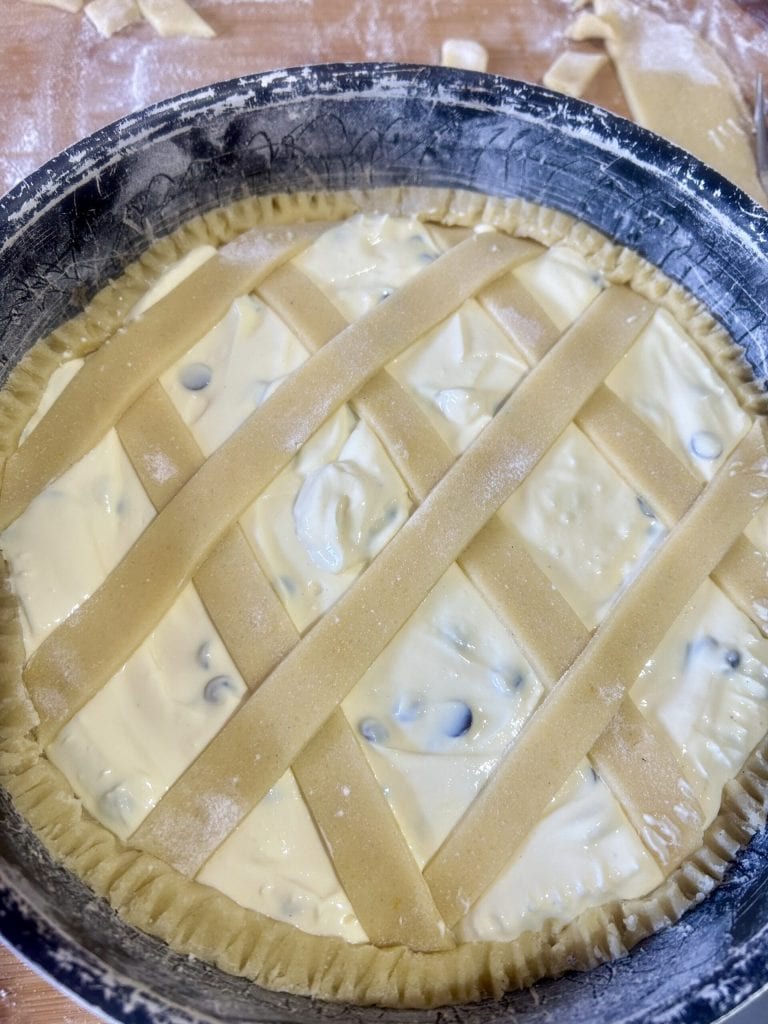 Verted dentro del molde la crema de ricotta nivelando con un tenedor. Tomad la masa quebrada sobrante y, con la ayuda del rodillo, extendéis sobre un papel de horno ligeramente enharinado para crear las tiras decorativas. Esta vez la masa quebrada se extiende muy fina y para cortar las tiras os sugiero una rueda cortapasta lisa o dentada, es indiferente. Doblad el borde ayudándoos con la punta enharinada de un tenedor para crear el borde exterior de vuestra tarta.