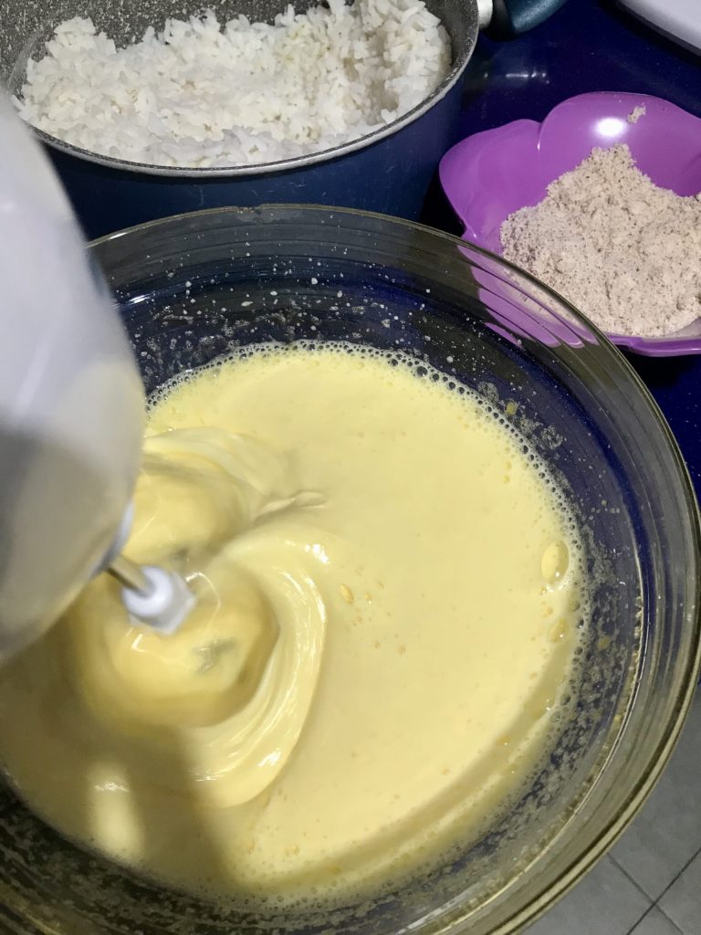 • Comenzando con el arroz ya hervido y enfriado, ponga los huevos en un bol y añada el azúcar.