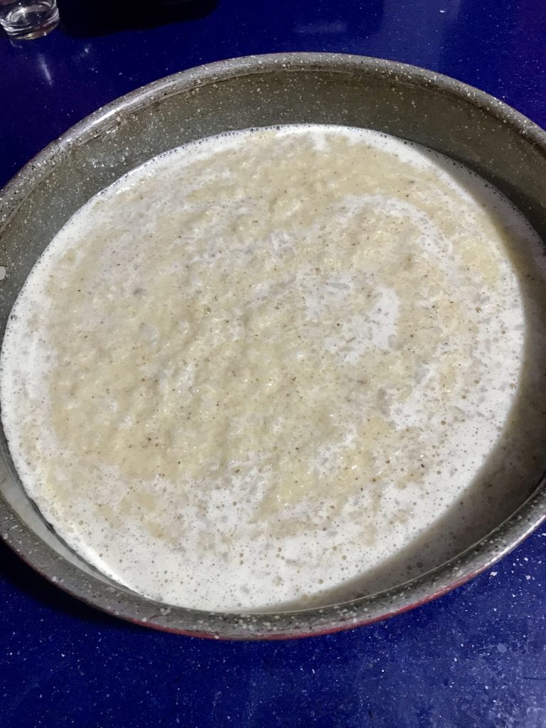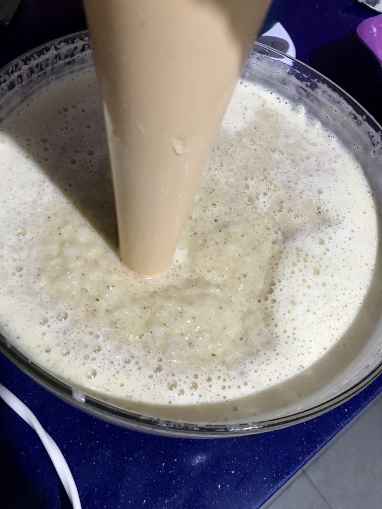 • Bata bien los huevos con el azúcar, añada la harina de almendra, la copita de amaretto, la vainillina o aroma de vainilla y por último el arroz hervido.