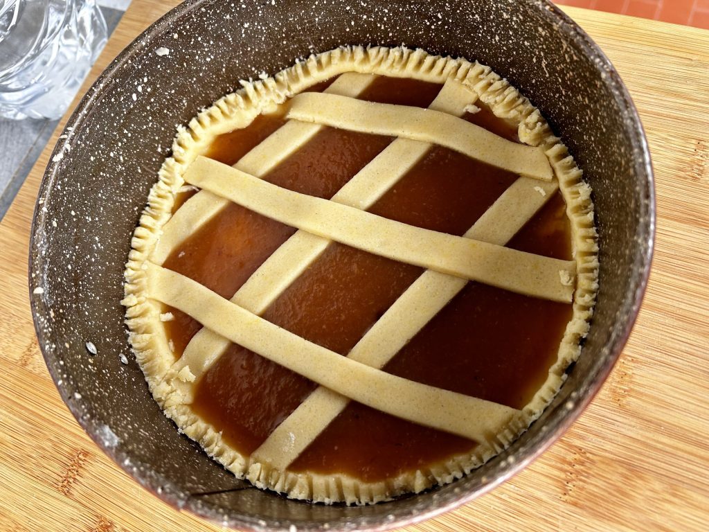 Ahora no os queda más que cubrir la base de masa quebrada con la mermelada, cubrid uniformemente toda la base. Ahora retomad la masa quebrada sobrante y extendédla sobre una hoja de papel de horno ligeramente enharinada. A diferencia de la base esta vez debéis extender la masa quebrada muy fina, pocos milímetros de grosor. De esta recortad tiras de poco menos de un centímetro de ancho y entrelazadlas a vuestro gusto sobre la tarta, cortad los excesos y con la ayuda de los extremos de un tenedor plegad el borde de la tarta sobre sí mismo para rematar toda la circunferencia. Presionad ligeramente para que los dientes del tenedor se impriman en el borde, servirán de decoración y para evitar que el borde se desprenda de la mermelada durante la cocción.