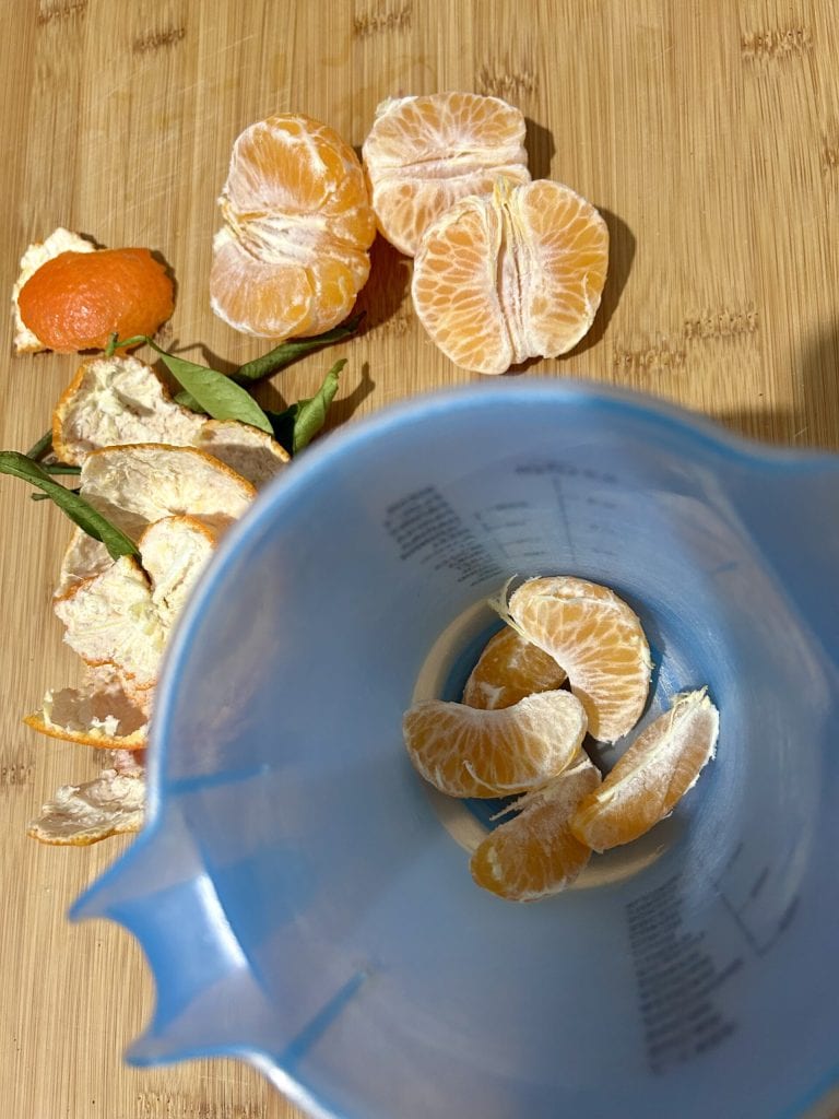 El primer paso consiste en pelar las mandarinas y triturarlas. Yo he utilizado una batidora de inmersión dentro de un vaso medidor.