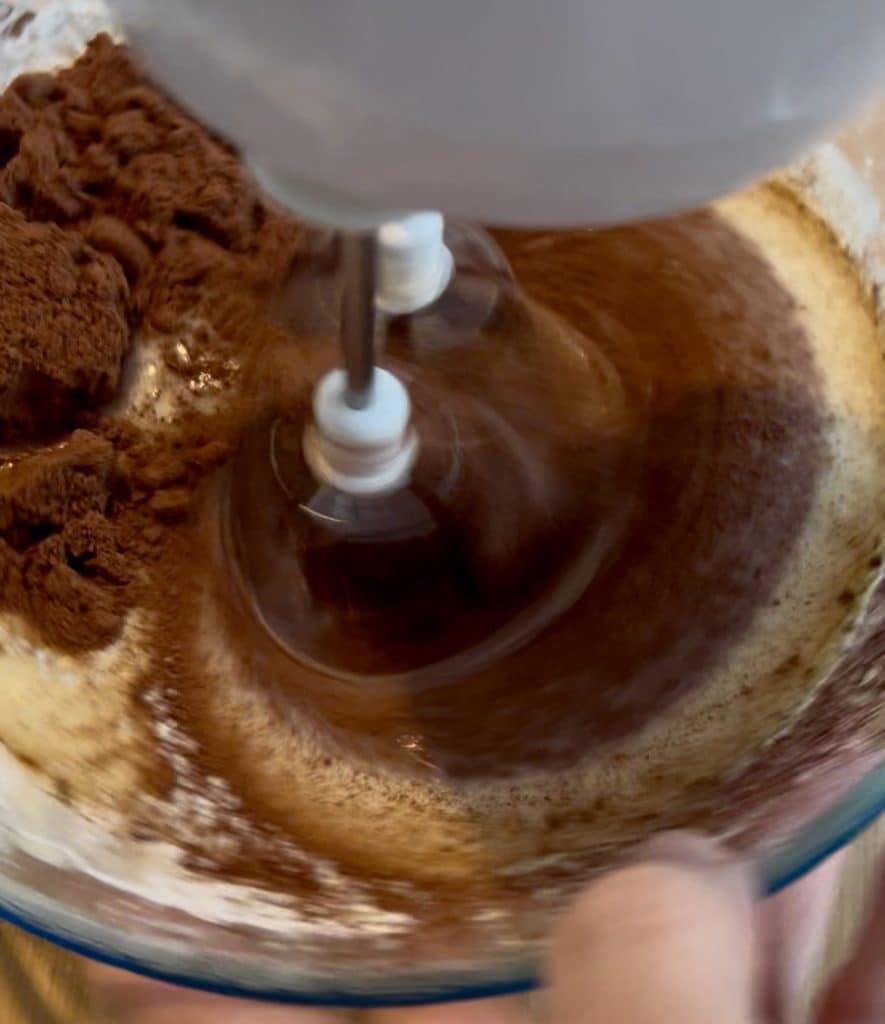 En este punto, mientras seguís usando las batidoras, añadid los líquidos, luego poco a poco los polvos, teniendo cuidado de bajar ligeramente la velocidad cuando añadáis la harina, el cacao y la levadura, así evitaréis esparcirlo todo alrededor.