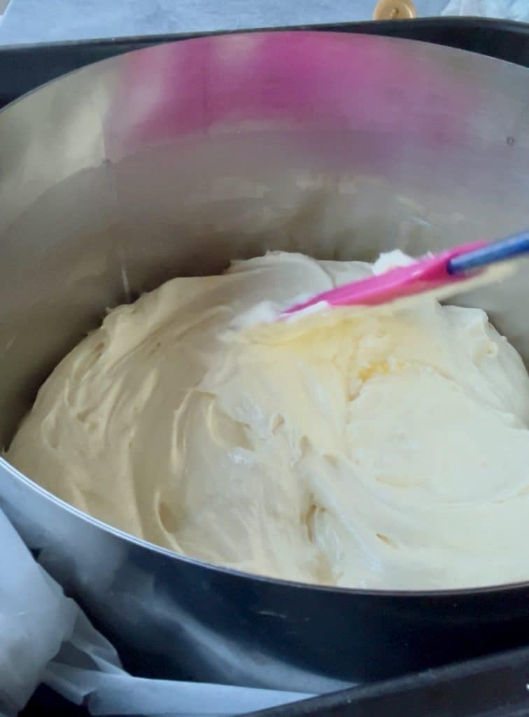 En este punto, solo queda verter la masa en el molde. La masa será suave pero bastante compacta, así que te recomiendo nivelarla con cuidado usando una espátula de silicona, para obtener una superficie regular.