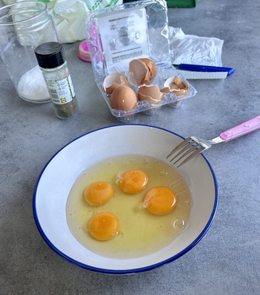 Mientras doras la cebolla, abre los huevos en un plato hondo, sálalos y añade un poco de pimienta; ayudándote con un tenedor, bate los huevos groseramente, no deben ser completamente homogéneos, ¡una buena tortilla se ve por su consistencia desigual, no debe ser una crepe!