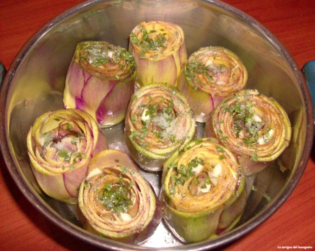 En cada alcachofa, insertar entre las hojas 2-3 tiras de ajo y algunos trozos de perejil.