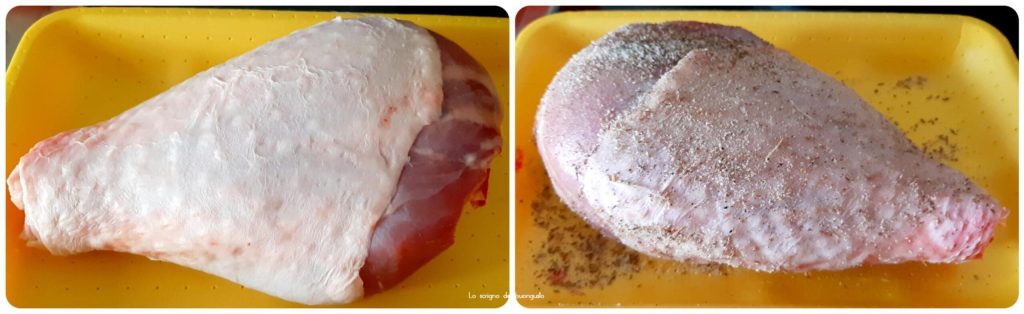 En este punto, envolver el muslo primero en un papel de horno, luego en uno de aluminio, ajustarlo bien apretando el papel.