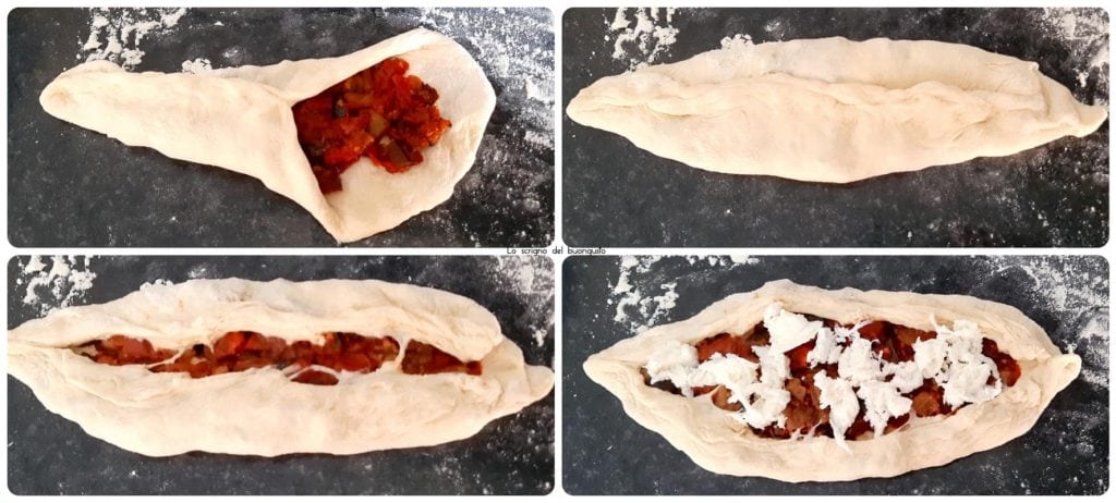 Pasado el tiempo, extienda cada bolita en forma ovalada, rellénelas con el condimento de berenjena dejando un borde de aproximadamente 2 dedos en toda la circunferencia….