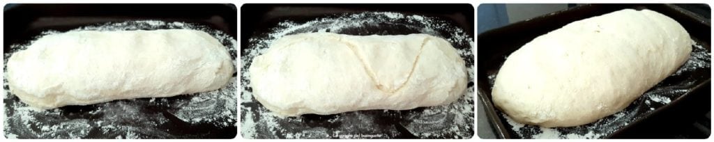 Pasado el tiempo, espolvorear la superficie de la masa y despegarla de las paredes del bol, tomar una bandeja de horno forrada con papel de horno y verter la mezcla para nuestro pan tratando de darle forma de barra con las manos.