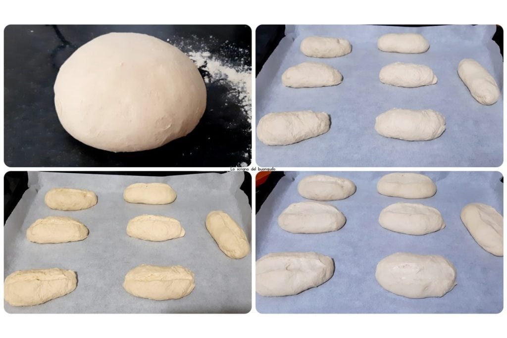 Al alcanzar el levado, verter la masa sobre una superficie de trabajo enharinada, recrear una bola y dividirla en 7 partes iguales de aproximadamente 120 g cada una, con cada pedazo de masa formar bollos alargados, colocarlos en una bandeja de horno cubierta con papel de hornear.