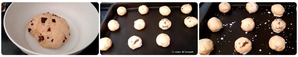 Mezclar bien, finalmente añadir el chocolate negro en trozos o las pepitas de chocolate, verter la mezcla sobre una superficie de trabajo y formar una bola bien trabajada.