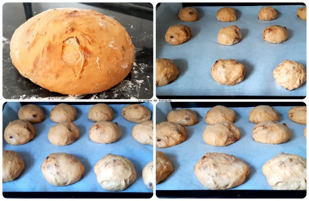 Pasado el tiempo, retomar la masa y transferirla a una superficie de trabajo enharinada, formar bolitas de 55-60 gr de peso aproximadamente y dejarlas leudar sobre una bandeja de horno forrada con papel de horno durante aproximadamente 1 hora.