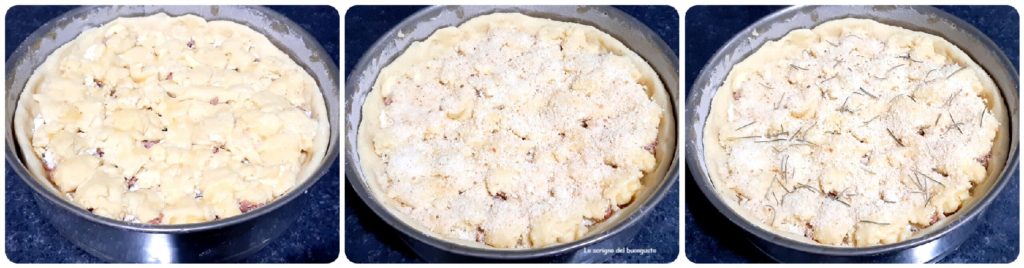 He creado una masa a base de patatas cocidas para crear la base y la superficie del pastel, para luego rellenarlo con la pasta de salchicha, mozzarella y adornarlo con parmesano, pan rallado y un toque de romero.