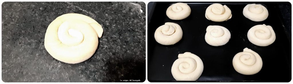 • Colocar las espirales obtenidas en una bandeja de horno bien separadas y dejar fermentar hasta que doblen su tamaño.