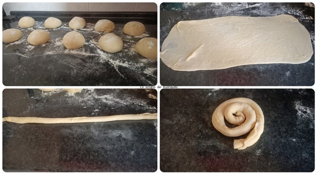 Transcurrido el tiempo, tomar cada bolita y estirarla hasta obtener una tira de masa larga y fina, pincelarla con la mantequilla y enrollarla sobre sí misma por la parte larga.