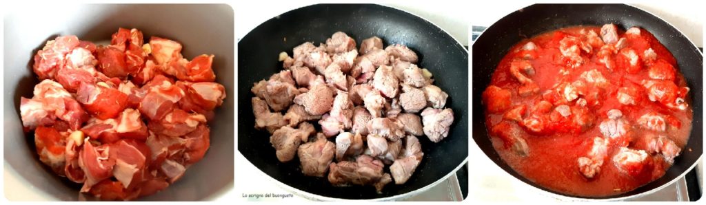 • Cortar la carne de cordero en trozos no demasiado grandes, ponerlos en un tazón con los ajos cortados en trocitos, sal, romero, pimienta, mezclar bien y dejar reposar al menos 2 horas en la nevera.