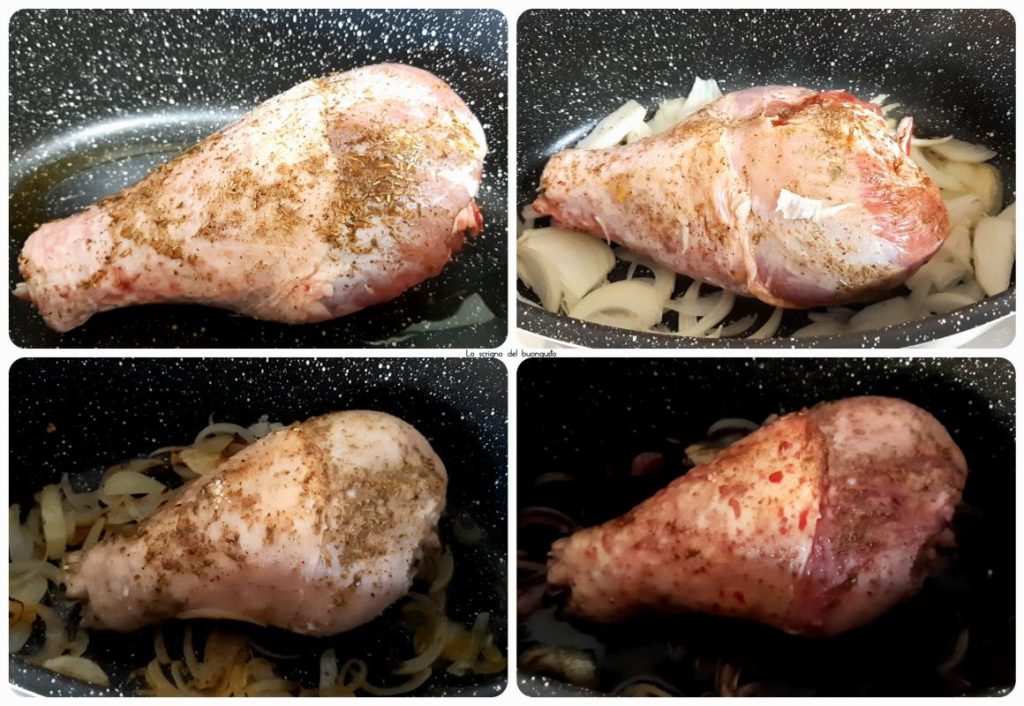 En este punto, añadir el vino y cocinar a fuego medio bajo durante aproximadamente 1 hora y ½, girando la carne de vez en cuando.