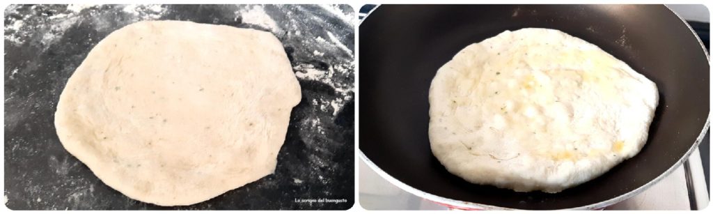 Calentar una sartén, engrasarla con un poco de aceite de oliva virgen extra, poner la focaccella aplastada y pincelar también la superficie con un poco de aceite.