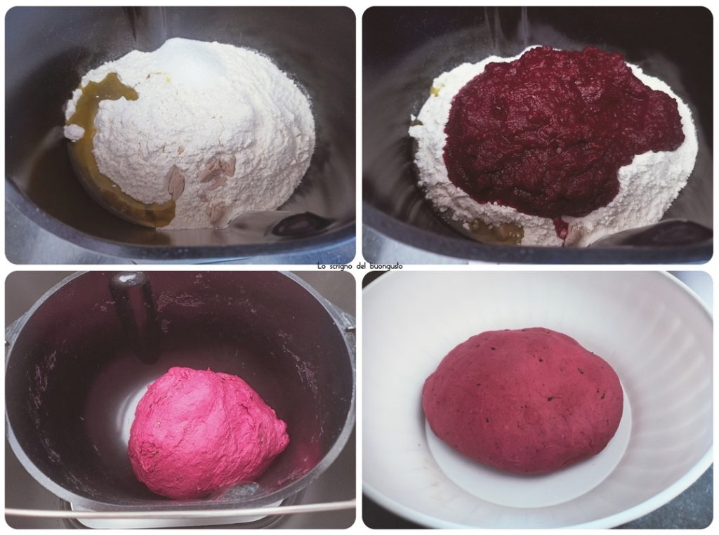 • A continuación, tomar el cubo de la panificadora, colocar la pala para amasar y verter la harina y la levadura fresca; en el lado opuesto poner la sal, verter la crema de remolacha y añadir el aceite.