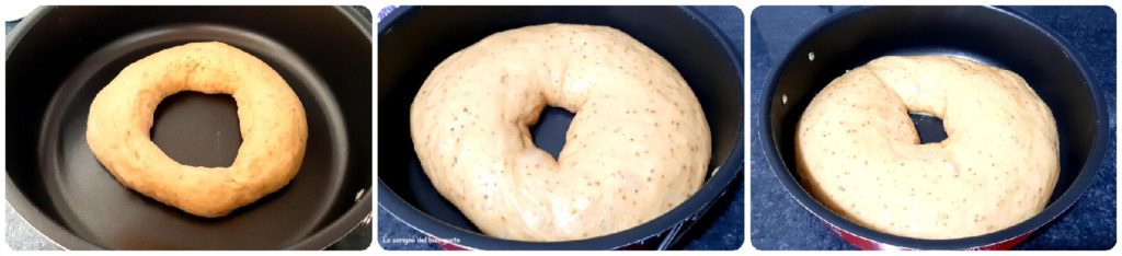 Una vez que haya levado, verter la masa sobre una superficie de trabajo, dividirla en dos partes y formar 2 rosquillas.