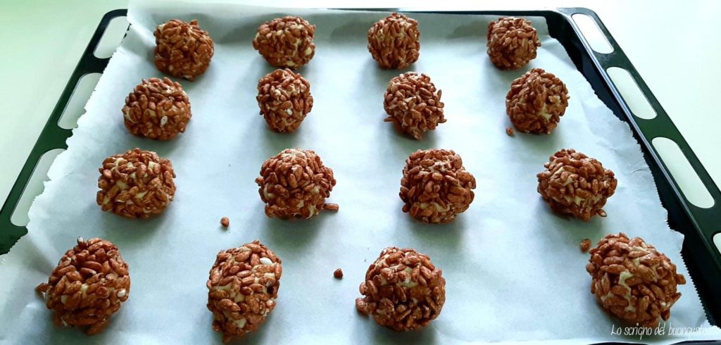 Obtenida una mezcla homogénea, crear bolitas no demasiado grandes con dos cucharas y verter una a la vez en un bol con el arroz inflado, rodándolas y luego acomodarlas con las manos