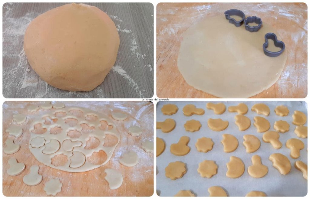 Obtén láminas de masa de aproximadamente 2 milímetros de grosor, luego con los moldes corta unas galletas y si no tienes moldes bonitos como los míos, puedes usar un cortador pequeño, un vaso o cortarlos a mano dándoles formas triangulares, hexagonales, etc.Colócalas en una bandeja de horno forrada con papel de horno y hornea en horno precalentado a 180°C durante unos 10 minutos controlando la cocción.