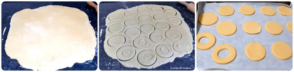 Sacar círculos con un vaso o un cortador de pastas, la mitad serán enteros y la otra mitad tendrán un agujero en el centro.