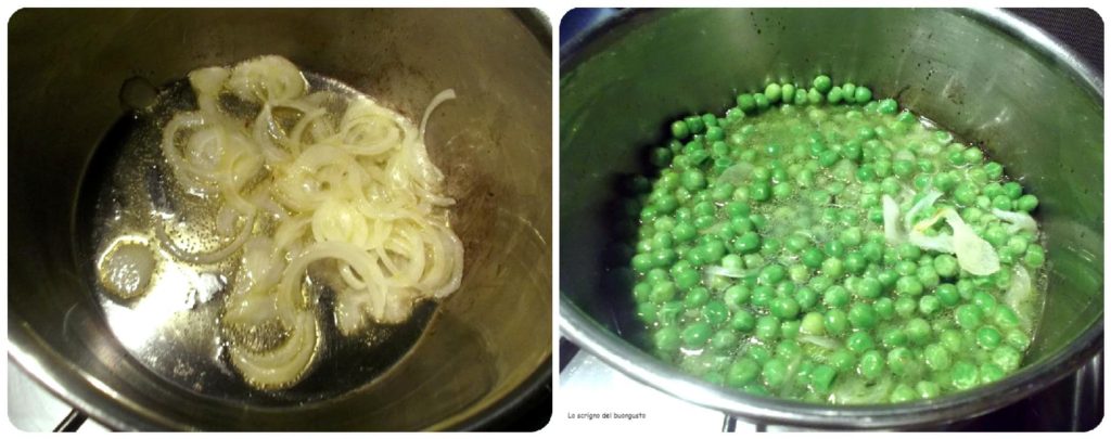 Añadir los guisantes, 1 vaso de agua, salpimentar y cocinar tapado durante 20-30 minutos comprobando la cocción.