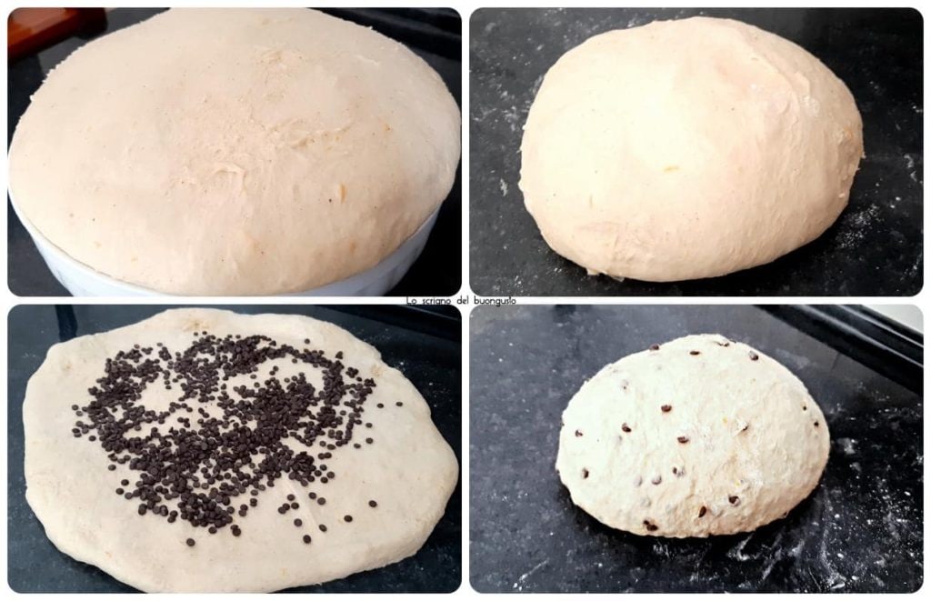 Pasado el tiempo de fermentación, verter la masa sobre una superficie de trabajo ligeramente enharinada, extenderla con un rodillo formando un rectángulo, añadir los trocitos de chocolate, cerrar la masa sobre sí misma y trabajarla durante unos diez minutos hasta formar una bola homogénea.