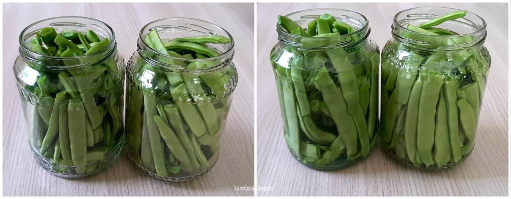 Cortar las puntas de las judías planas, lavarlas bien, escurrirlas y colocarlas en los tarros en sentido vertical llenando bien el tarro, luego añadir el agua hasta aproximadamente 2 dedos del borde.