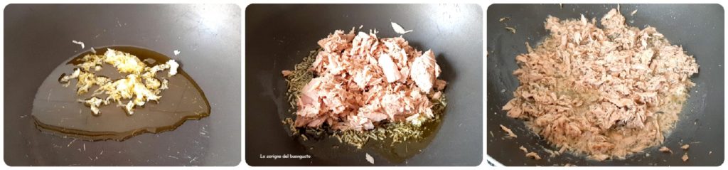 • Toma una sartén antiadherente y sofríe los dientes de ajo machacados con el aceite de oliva. Luego añade el atún bien escurrido y desmenuzado, ajusta de sal y pimienta y deja que se impregnen los sabores unos minutos.